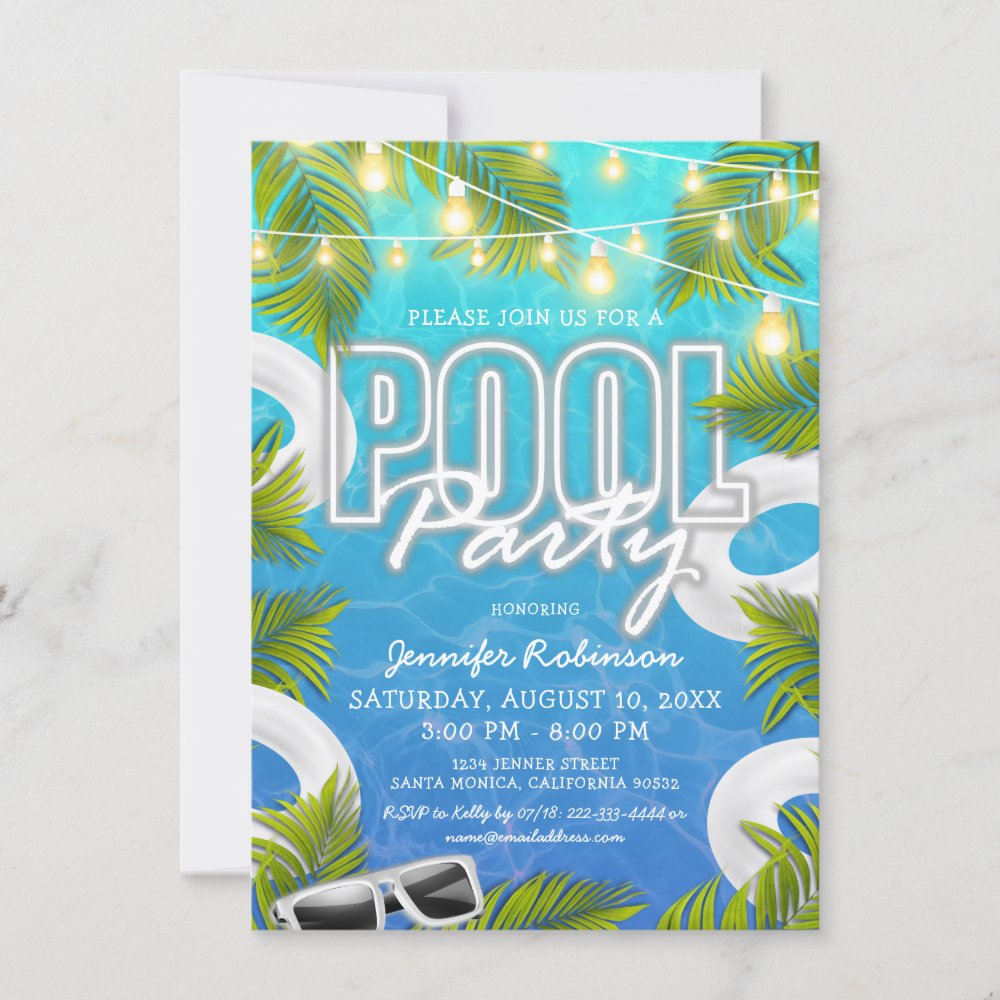 This white pool party birthday invite combines minimalist design with seasonal vibes. The crisp white layout accented with tropical elements sets the tone for a chic yet relaxed gathering. Whether you’re hosting a backyard bash, resort event, or beach club birthday, this template adds sophistication to your summer party.